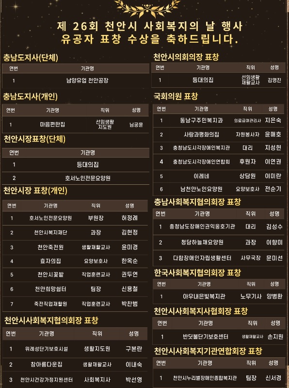 제 26회 천안시사회복지의 날 행사 유공자 표창수상 페이지 정보 작성자작성자 : 천사협 조회조회수 : 634회 작성일작성일 : 25-09-23 13:14 본문 수상을 축하 드립니다! 목록 다음글「제26회 천안시사회복지의 날 행사」사회복지 유공자 추천 협조 요청 25.07.28